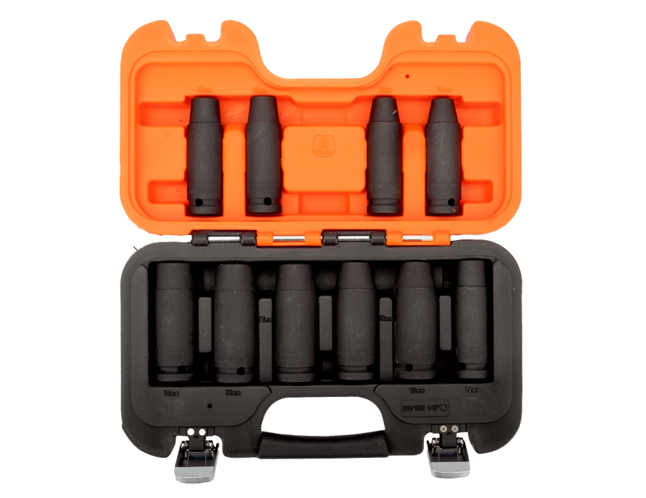 - Set of 1/2″ deep impact sockets, 10mm, 11mm, 12mm, 13mm, 14mm, 15mm, 16mm, 17mm, 18mm, 19mm