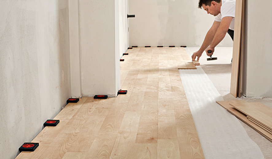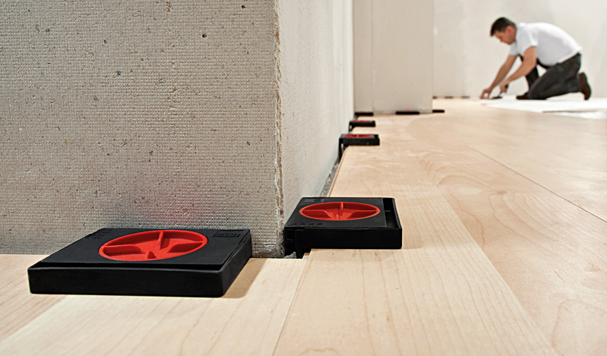 Set up is fast and simple. Inserted between the wall and the first row of flooring, the distance to the wall can be set simply by turning the red dial. When the installation work is finished, the spacer is easy to remove
