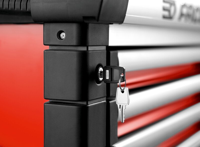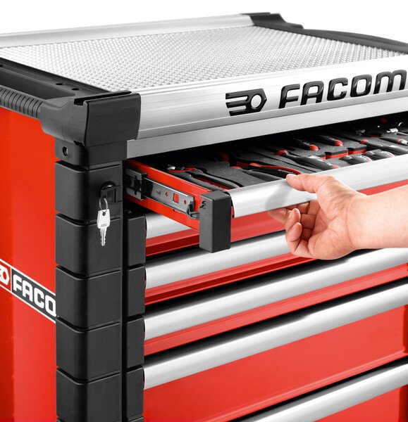 Equipped with ball bearing slides, total extension with «self close» return spring for an efficient and secure closure – 100% opening drawers for optimum ease of use. The 60 and 130 mm drawers can be fitted with thermoshaped or foam modules from Facom Modular system program. The 200 mm drawers can also be fitted with modules. Ergonomics and Safety : Exclusive FACOM design ensuring easy grip. Lifting handpulls made of anodized aluminum with safety hook avoiding any opening while. Premium self-closing system ensures secure closure and further safety. Centralized locking system, delivered with 2 keys, one folding. With new soft bumpers in elastomeric thermoplastic with damper effect shock: on the 4 angles and on drawers protecting the safety hook.
