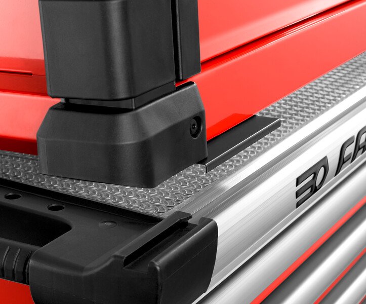 Extra large worksurface : +25% vs JET+. High resistance : a 2 mm aluminium plate -rice grain finish- covers a 15 mm wooden board. The end caps are made of impact-resistant polypropylene. The worktop can receive a vice and is resistant to impacts and hydrocarbons. Static load resistance : M3 900kg, M4 1000kg, M5 1100kg. Even more functional : integrated bi-material handles with soft coating on each side of the cabinet : one for moving and one to lift the roller cabinet and ride over obstacles.