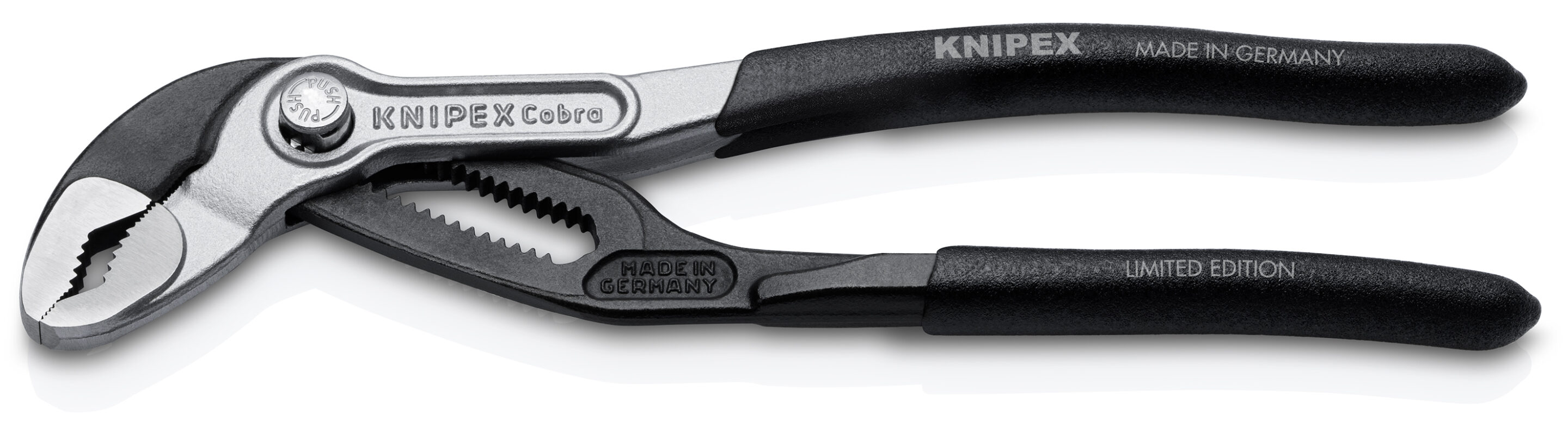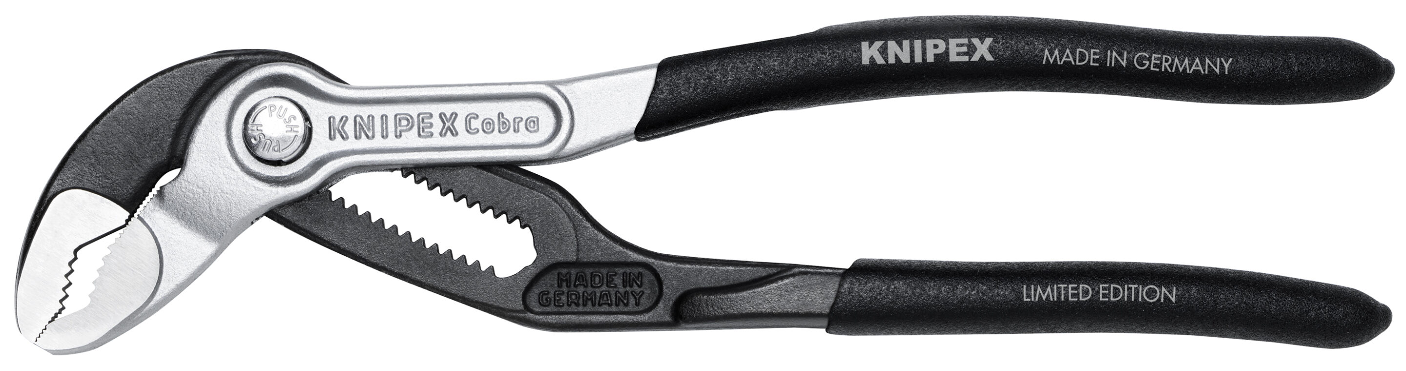 These high-quality water pump pliers are something very special, because the limited bicolour edition is half bright chrome-plated and half dark phosphated with elegant black, slim plastic grips! At second glance, it also reveals clever high-tech qualities: fine adjustment that is as sensitive as it is robust, the enormous gripping width for workpieces up to 42 mm in diameter for a tool length of 180 mm, plus the already legendary self-locking effect of all KNIPEX Cobras®. In festive gift packaging to match the occasion.