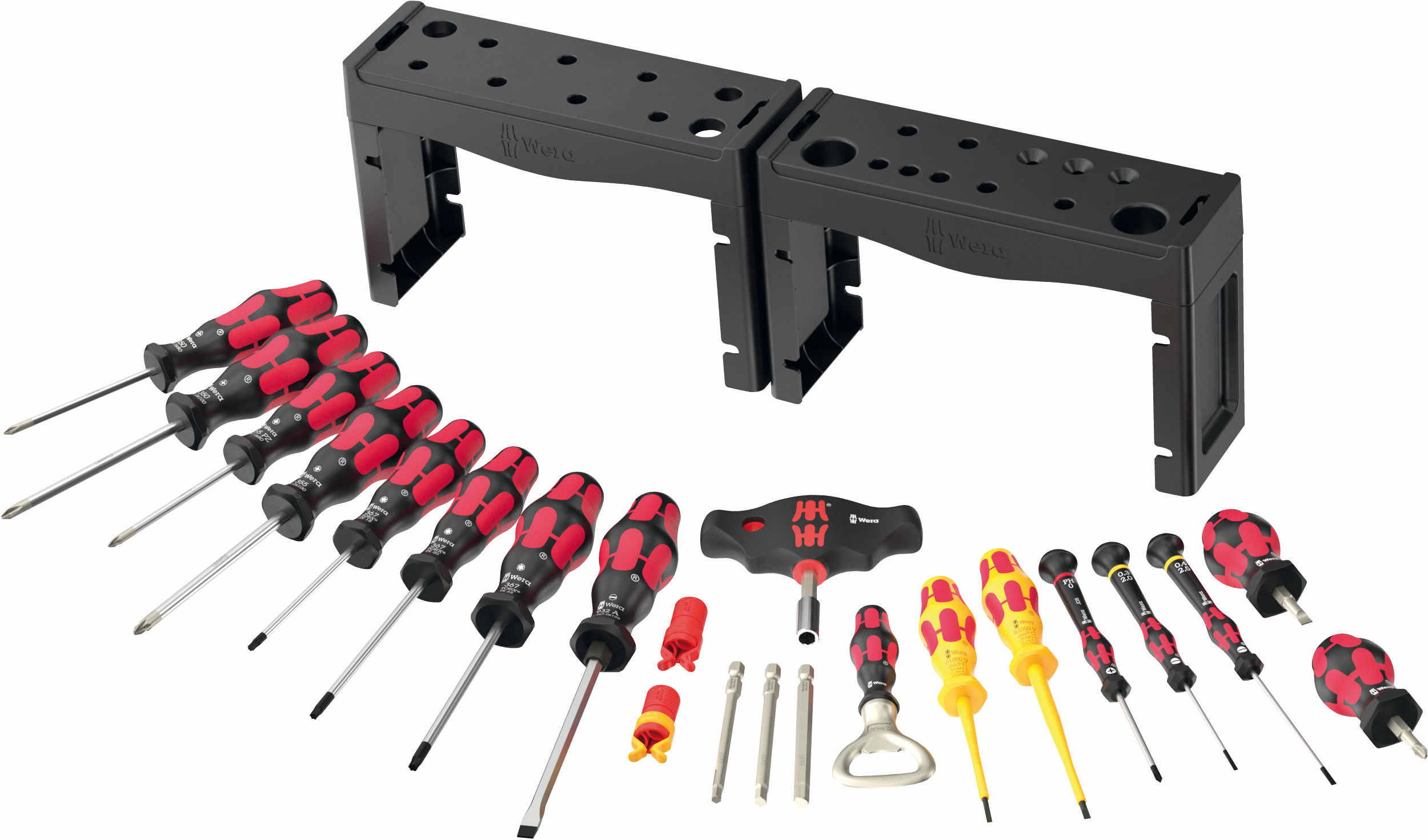 The 2025 Wera Advent Calendar is here! Father Christmas includes a comprehensive screwdriving workshop for the most common screw profiles and screwdriving operations. The two included racks can be placed upright or hung on the wall. The giftee can look forward to 28 surprises: 15 screwdrivers, two of them slotted for VDE, 2 Stubbys, 3 Micro tools for precision engineering and a chiseldriver with impact cap and pound-thru blade. One bit holding screwdriver with T-handle for ¼” bits and 3 long bits (89 mm) complete the content perfectly. The T-handle fits well in the hand, which allows the transmission of high torques. The two screw grippers hold screws securely on the tool. The bottle opener is a must for all Advent calendar fans – in 2025 once again in a special design only included in the calendar. Two racks ensure neat storage of all the tools (and the bottle opener).